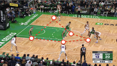 The screenshot below perfectly illustrates what the Celtics were trying to achieve. On the play, there is a spread pick-and-roll in the middle of the court with Booker on one wing. Note how close Al Horford is to Booker on the weak side compared to the rest of the Celtics players and their matchups. The Celtics were happy to let them play four-on-four as long as Devin Booker didn’t get the ball.
