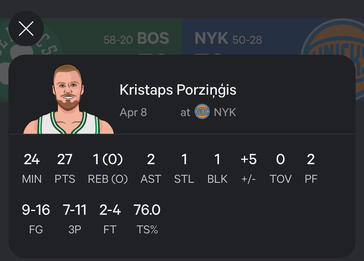 Celtics Stats: Kristaps Porzingis tied his career-high with eight 3-point makes tonight in New York. -via Twitter / April 8, 2025