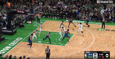 Transition defense isn’t just about running back — it’s also about communication. Here, both Jaylen and Jayson look overwhelmed by the Knicks’ fastbreak. Tatum can’t contain Miles McBride’s drive, and Brown isn’t even looking at the ball or helping, which leads to a dunk.