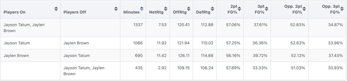Two seasons ago, #Celtics went from +12 per 100 with just Tatum on to +3 with Brown on, Tatum off.