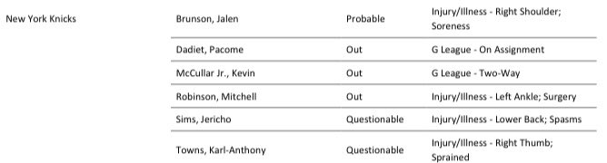 And the Knicks are crossing their fingers hoping that Towns is healthy. He suffered a sprained right thumb with a bone chip Monday against Detroit, an injury that sidelined him Wednesday in Philadelphia. League sources have indicated that the bone chip is not serious enough to sideline him — and the 43 minutes he played Monday despite suffering the injury in the first quarter back that up — and that the swelling from the sprain is the issue. -via Newsday / January 17, 2025