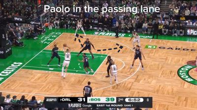 With KCP sliding over, Paolo Banchero has to zone up between Brown and Horford. Paolo does a good job splitting the difference, but a pass to either Celtic would put Orlando in scramble mode. Another answer here is for Porzingis to simply take the shot. He has a window, and has made a career out of shooting over guys.