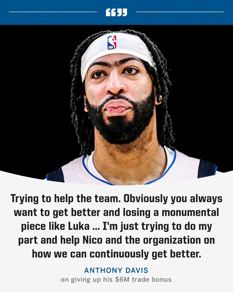 AD on why he gave up his $6 mil trade bonus: “Trying to help the team. Obviously you always want to get better & losing a monumental piece like Luka … it’s a lot, right? So I’m just trying to do my part and help Nico and the organization on how we can continuously get better.” – 12:31 PM