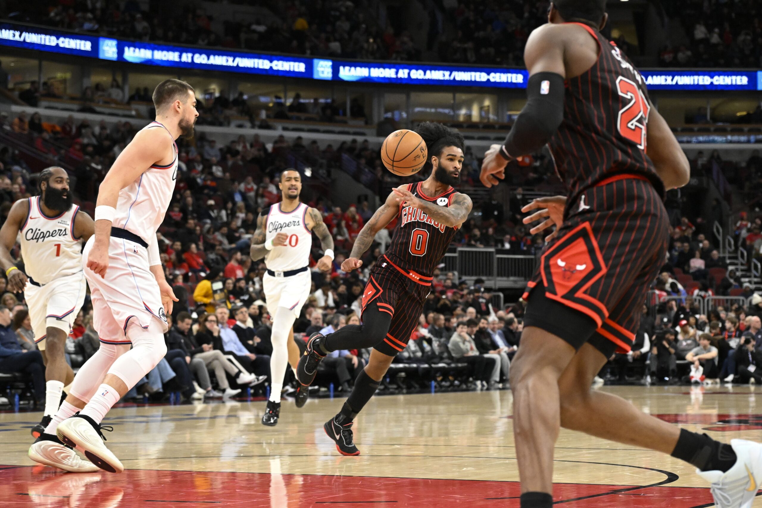 Jan 20, 2026; Chicago, Illinois, USA; Chicago Bulls guard Coby White (0) passes the ball against the LA Clippers during the second half at United Center. Mandatory Credit: Matt Marton-Imagn Images