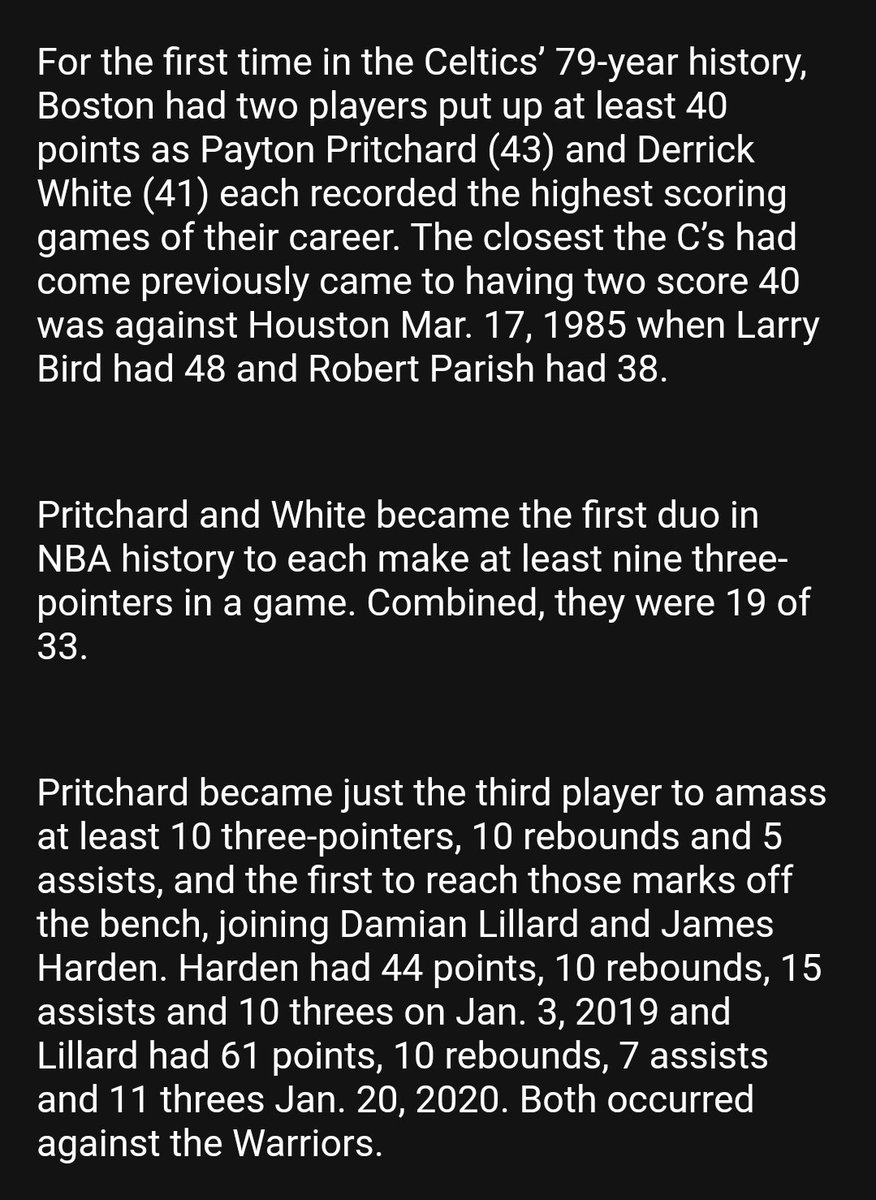 Tom Haberstroh: Payton Pritchard (41) and Derrick White (41) become first Celtics teammates to have 40+ points in the same game, per @Stathead. And there have been some Celtics teammates…
