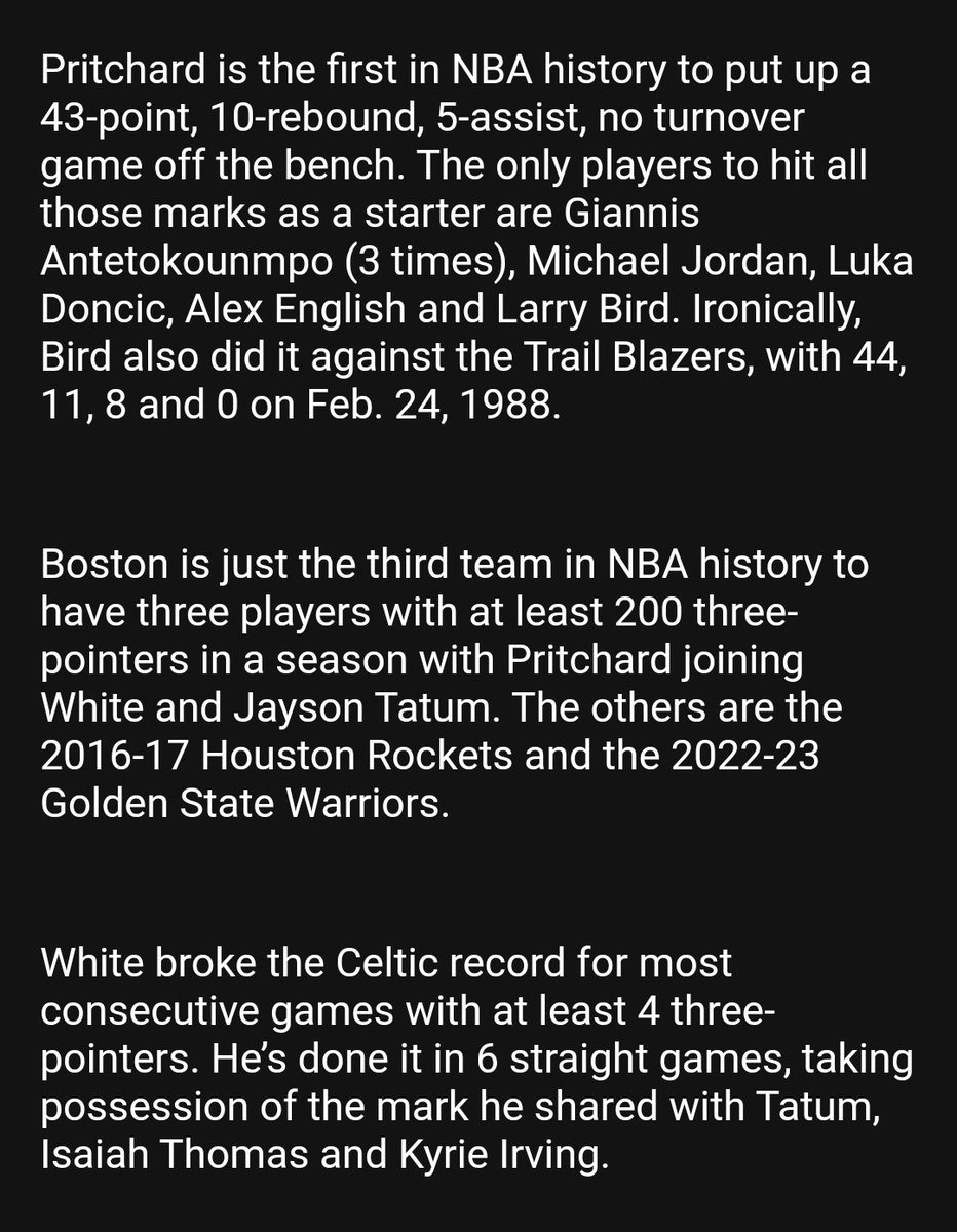 @DickLipe with the relevant noteage from a record-breaking night in the Celtics’ win over Portland. pic.x.com/pzF2qkkV4X – 11:45 PM