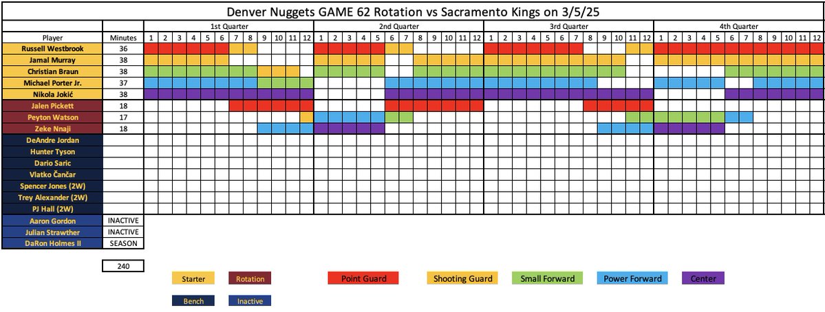 Final Rotations for the Nuggets as they defeated the Kings 116-110.