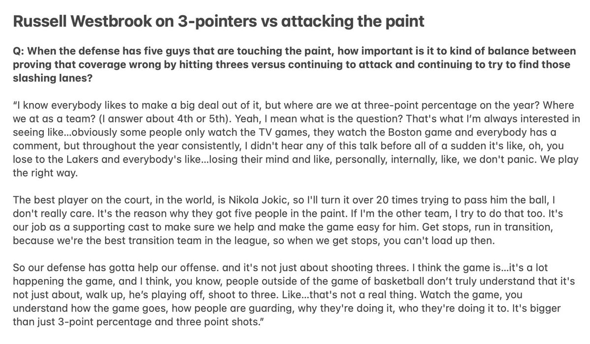 Earlier tonight, I asked Russell Westbrook about how to punish a defense that commits so much to preventing shots in the paint.