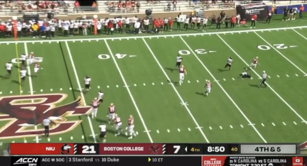 On Saturday, Boston College’s Thomas Castellanos was flushed out from his own 46 to inside the 15 as he evaded NIU defenders before eventually hitting Lewis Bond downfield to keep the Eagles’ drive alive.