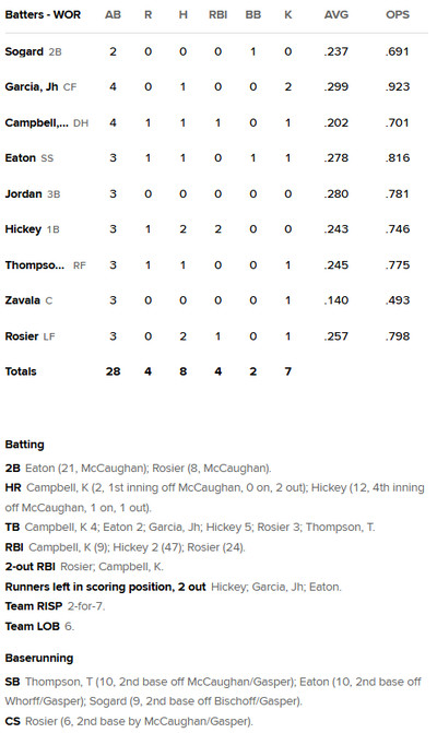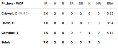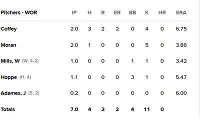 Worcester bullpen-gamed-it, with Isaac Coffey allowing two runs in two innings to start, and Wyatt Mills picking up his fourth win in relief. Jose Adames earned his second save.