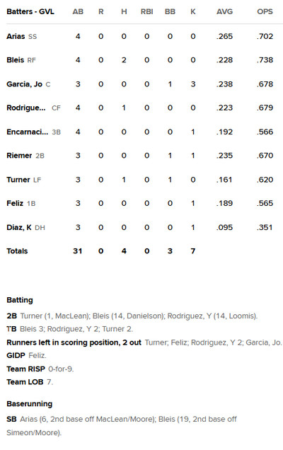 The Drive could never get the bats going in this one, mustering just four hits. Two of those hits came from Miguel Bleis, who also stole a base, improving his average to .228