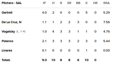 Salem opened up the scoring with a two-run second inning, including an RBI single from catcher Klayver Salazar. Starter Joey Gartrell threw four shutout innings, striking out five. After that, the Riverdogs (TB) took over, scoring eight runs against Salem relievers. Joe Vogatsky got the loss in a three-run seventh inning.